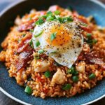 Alors, voilà ! J’espère que cette recette de riz frit bacon kimchi vous a mis l’eau à la bouche autant qu’elle m’a plu à la créer et à la perfectionner. Croyez-moi, c’est bien plus qu’un simple plat de riz frit. C’est une explosion de saveurs, une symphonie de textures, et une expérience culinaire inoubliable qui vous transportera directement en Corée (avec une petite touche de bacon bien gourmande, bien sûr!). Pourquoi devriez-vous absolument essayer cette recette ? Eh bien, laissez-moi vous rafraîchir la mémoire. Premièrement, la combinaison du kimchi fermenté, du bacon croustillant et du riz parfaitement cuit est tout simplement divine. L’acidité piquante du kimchi se marie à merveille avec le côté salé et fumé du bacon, tandis que le riz apporte une base réconfortante et moelleuse. Deuxièmement, c’est une recette incroyablement facile et rapide à préparer. En moins de 30 minutes, vous pouvez avoir un repas délicieux et satisfaisant sur la table. Troisièmement, c’est une excellente façon d’utiliser les restes de riz et de kimchi que vous avez peut-être dans votre réfrigérateur. Zéro gaspillage, un maximum de saveurs ! Mais ce n’est pas tout ! Les possibilités de variations sont infinies. Vous pouvez ajouter des légumes supplémentaires comme des carottes râpées, des petits pois ou des champignons émincés pour une version plus nutritive. Pour une touche de fraîcheur, n’hésitez pas à parsemer de la coriandre fraîche hachée ou des oignons verts émincés juste avant de servir. Si vous aimez les plats épicés, ajoutez une cuillère à café de gochujang (pâte de piment coréenne) ou quelques gouttes de sriracha pour un coup de fouet supplémentaire. Vous pouvez également remplacer le bacon par du tofu fumé pour une option végétarienne tout aussi savoureuse. En termes de suggestions de service, ce riz frit bacon kimchi est parfait tel quel pour un déjeuner rapide ou un dîner décontracté. Vous pouvez également le servir avec un œuf au plat sur le dessus pour un repas plus complet et protéiné. L’œuf coulant se mélange parfaitement au riz et ajoute une richesse supplémentaire. Une autre option consiste à le servir en accompagnement d’une viande grillée ou d’un poisson. Il se marie particulièrement bien avec du poulet teriyaki ou du saumon grillé. Alors, qu’attendez-vous ? Sortez votre wok, rassemblez vos ingrédients et lancez-vous ! Je suis convaincue que vous allez adorer cette recette autant que moi. N’hésitez pas à la personnaliser selon vos goûts et vos envies. L’important, c’est de s’amuser en cuisine et de créer un plat qui vous plaît. Et surtout, n’oubliez pas de partager votre expérience ! J’aimerais beaucoup savoir ce que vous avez pensé de cette recette. Laissez un commentaire ci-dessous, partagez vos photos sur les réseaux sociaux et taguez-moi (@VotreNomUtilisateur). J’ai hâte de voir vos créations et de lire vos commentaires. Bon appétit et à bientôt pour de nouvelles aventures culinaires !