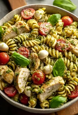 Et voilà ! Nous avons exploré ensemble les délices de cette recette qui, je l’espère sincèrement, deviendra un pilier de votre répertoire culinaire. Cette Chicken Pesto Pasta Salad n’est pas qu’une simple salade de pâtes ; c’est une célébration de saveurs, de textures et de la facilité en cuisine. Je l’ai conçue avec l’idée d’offrir une solution rapide pour les soirs de semaine où le temps est compté, mais sans jamais sacrifier le goût ou la qualité. C’est la salade parfaite pour ces moments où l’on souhaite se régaler sans passer des heures derrière les fourneaux. Imaginez des pâtes al dente enrobées d’un pesto vibrant et parfumé, mélangées à des morceaux de poulet tendres et juteux, le tout rehaussé par la fraîcheur de tomates cerises éclatantes et la douceur de mozzarella fondante. C’est un équilibre parfait qui éveille les papilles à chaque bouchée, une symphonie de goûts qui danse sur la langue. Son côté rafraîchissant la rend idéale pour les journées chaudes, mais sa richesse en saveurs en fait également un plat réconfortant à tout moment de l’année. C’est le genre de plat qui apporte de la joie à la table, facile à partager, et qui laisse tout le monde satisfait et souriant.